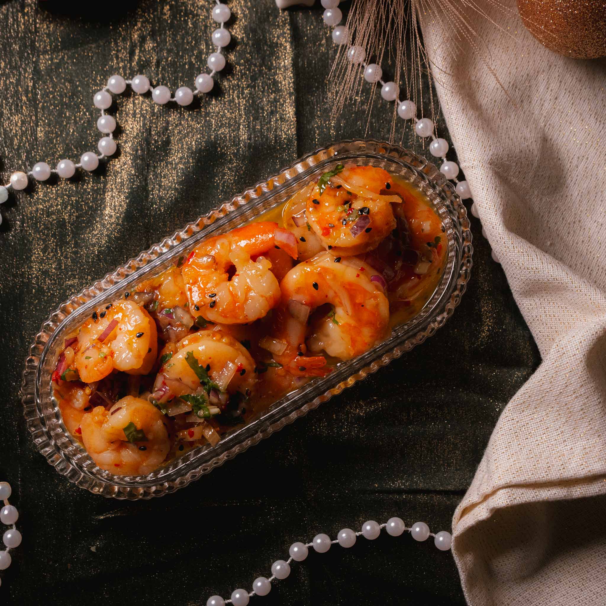 Krewetki w orientalnej marynacie na bazie oliwy, czarnego sezamu, sosów sojowych i świeżej kolendry. Aromaty lekko pikantne, głębokie, z wyraźną azjatycką nutą. Wyjątkowa propozycja dla tych, którzy lubią dodać do świątecznej kolacji szczyptę kulinarnego świata.