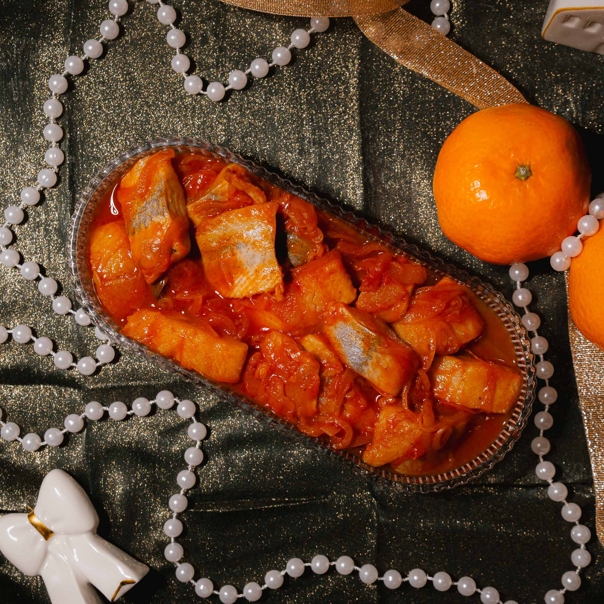 Ten śledź pachnie Wigilią już od pierwszego otwarcia. Karmelizowana cebula, słodka śliwka i korzenne przyprawy tworzą miękką, głęboką marynatę okalającą soczyste kawałki matiasa. Całość ma w sobie coś z dawnych, rodzinnych stołów — przyjemną słodycz, wyrazistość i pięknie skomponowaną, świąteczną pełnię smaku.