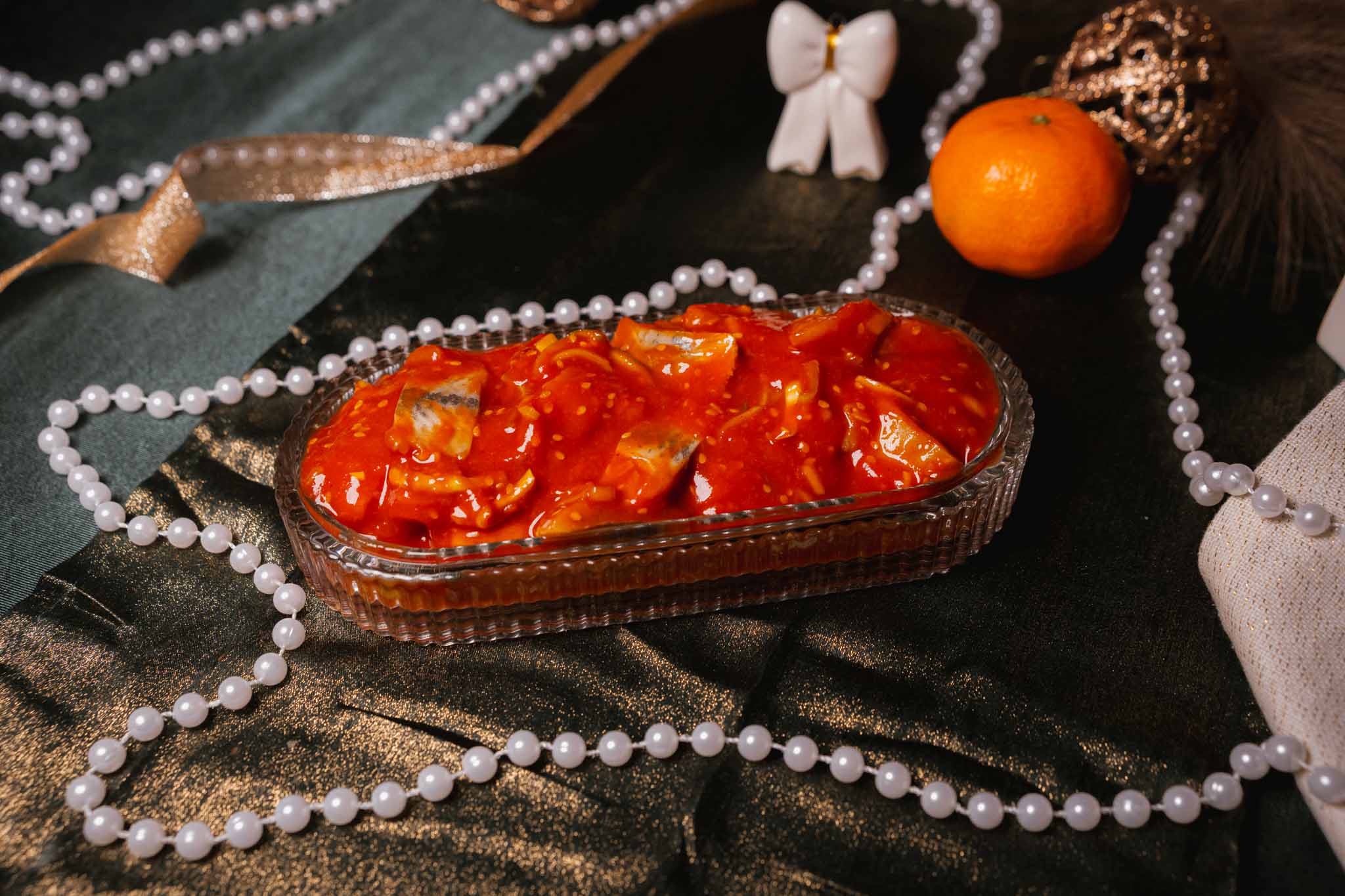Wyrazisty, mocny i pełen fermentowanej głębi sosu inspirowanego kimchi. Czosnek, imbir, chili i kiełki mung tworzą tło, które podbija naturalne umami matiasa. Smak jest intensywny, lekko kiszony i ostry, ale wciąż czysty — idealny dla tych, którzy chcą wnieść na wigilijny stół coś odważniejszego, ale wciąż pięknie zbalansowanego.