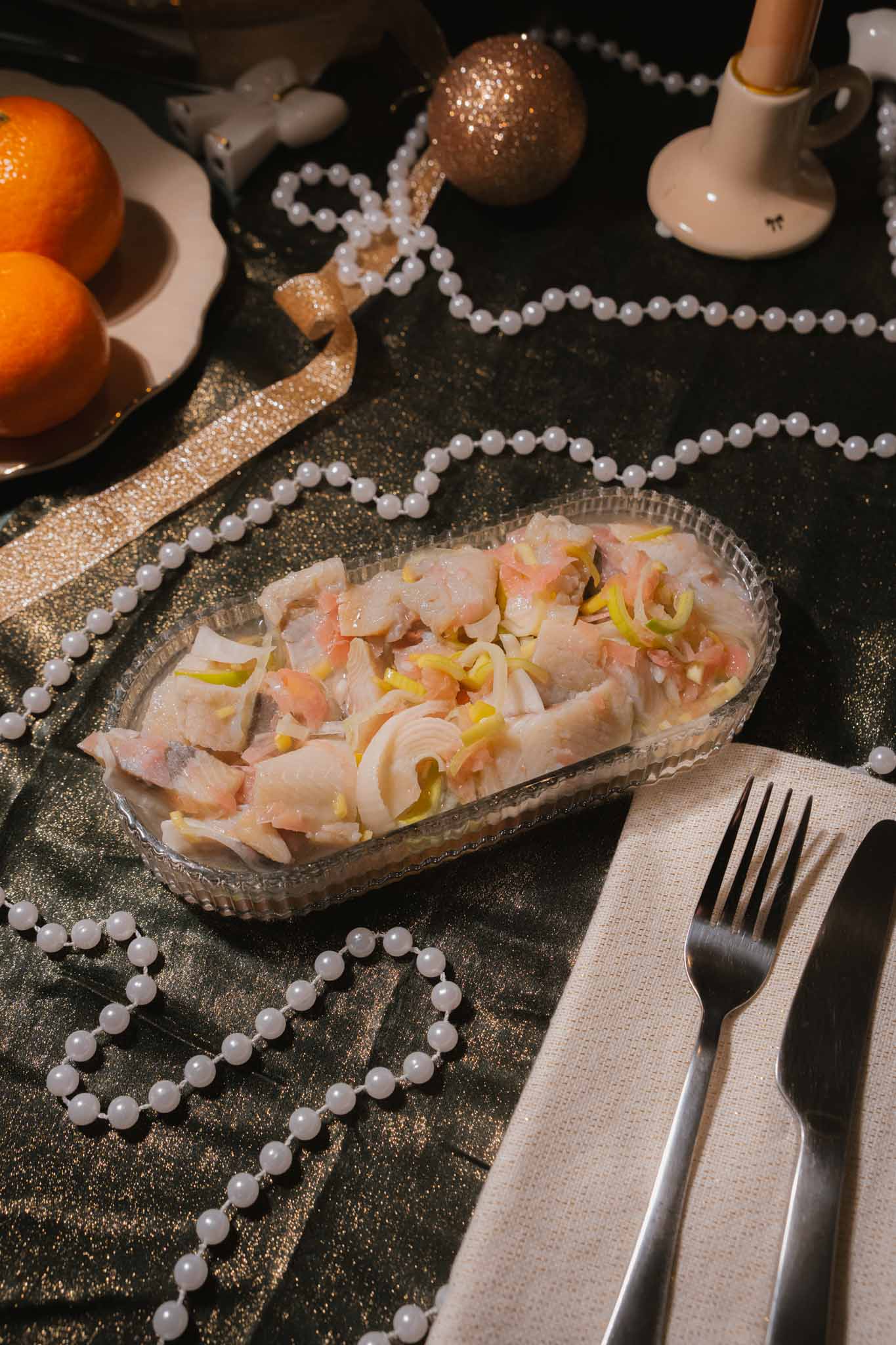 Zaskakująco świeży, delikatnie pikantny i pełen energii. Marynowany imbir wnosi subtelne ciepło, a cienkie paski pora dodają chrupkości, dzięki czemu każdy kęs ma świetną strukturę. Śledź pozostaje wyczuwalny i soczysty — to wariant, który wnosi na stół lekki, zimowy powiew i przyjemny, odświeżający akcent.
